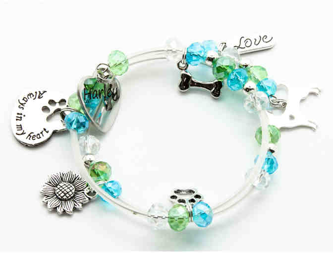 This is a memory wire bracelet with glass beads in shades of green and turquoise. Included are 7 charms: a laser engraved heart charm which reads "Harley", a cut-out charm which reads "Always In My Heart", a paw print outline shaped charm, a charm that reads "love", a sunflower charm, a dog bone charm, and a Chihuahua silhouette. This bracelet will fit a 6.5 to 7.5 inch wrist. Please treat it gently and do not wear in water.