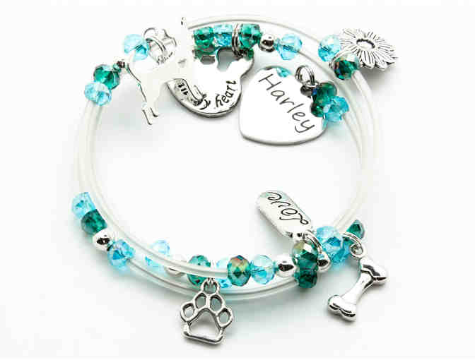 This is a memory wire bracelet with glass beads in shades of green and turquoise. Included are 7 charms: a laser engraved heart charm which reads "Harley", a cut-out charm which reads "Always In My Heart", a paw print outline shaped charm, a charm that reads "love", a sunflower charm, a dog bone charm, and a Chihuahua silhouette. This bracelet will fit a 6.5 to 7.5 inch wrist. Please treat it gently and do not wear in water.