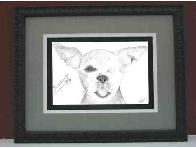 Original, one-of-a-kind custom-framed pencil sketch of Harley, drawn by a young Kansas artist. The piece measures 16”x 13”; outer wooden frame is black with an ornate carved design. Sketch is center-mounted on an urban black mat, surrounded by a narrow white floating mat and a gray textured mat to finish off the exclusive design. The frame contains an acrylic shatter-proof cover and an acid-free core foam backing. The art piece contains a special ‘preservation kit’ which ensures the sketch will last a lifetime. It also has a strap wire hanger on the back to make it easy to display.