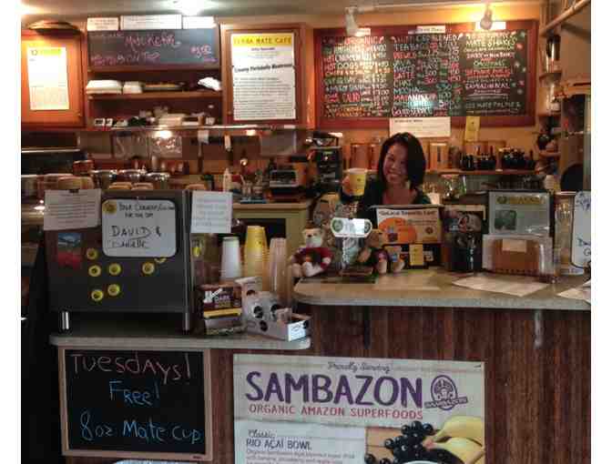 And of course, our sustainably, fair trade, organic yerba mate, in every and any way you can imagine: mate latte, cappuccino mate, mate mocha, mate chai, spicy mayan mocha mate, mate shake, espresso shot, iced mate, and mate drip brewed, among other offerings.