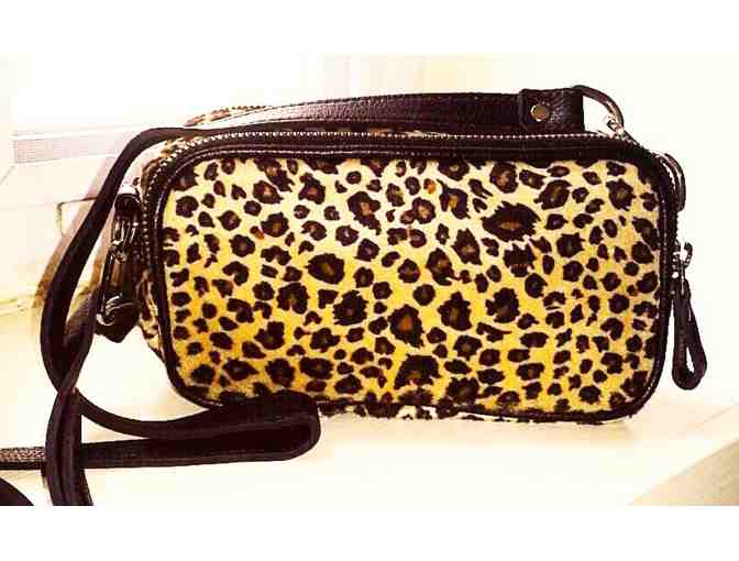 This beautifully designed Modus Rio handbag's body is designed with leopard print fabric and a leather structure and interior with double zippers 4 1/2" H x 8" W x 3" D.