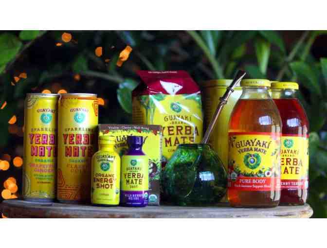 Gift basket of Guayaki Yerba Mate products includes 8oz Loose Traditional Mate, 1 gourd, 1 bombilla, 1 bag 25ct Traditional Mate Bags, 1 Can Sparkling Cranberry Pomegranate, 1 Can Bluephoria, 1 shot Lemon, 1 shot Lime, and 1 shot Wildberry Reishi.