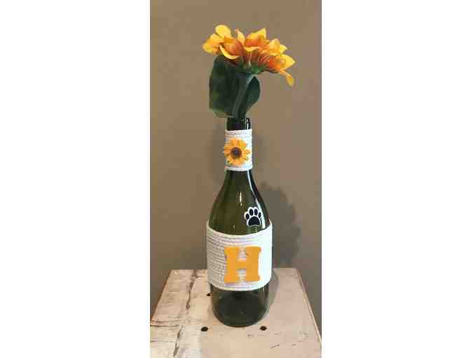 Custom, handmade Harley sunflower vase made from upcycled wine bottles with twine/craft cord. Includes the monogram "H", paw print and sunflower stickers.