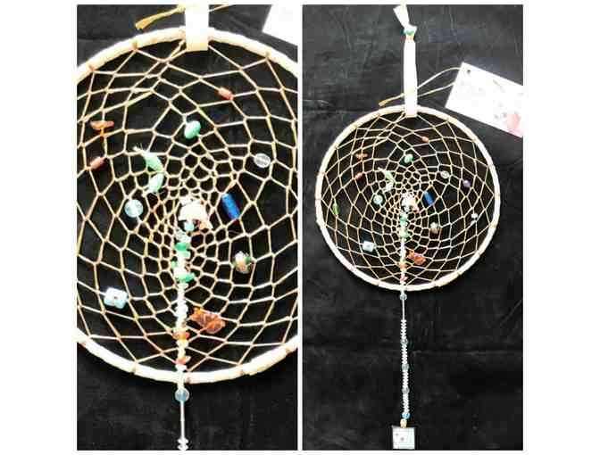 Handcrafted one-of-a-kind dreamcatcher. Measures 8" in diameter and is decorated with rainbow colored natural beads, two animal shaped beads and most importantly Sue Repash's Harley pendant! A dreamcatcher's purpose is to catch good dreams and send bad dreams away. What better way to promote Harley's Dream than with this custom Harley dreamcatcher!