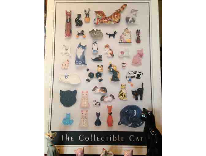 This lot includes a framed poster and five vintage, collectible cats. The poster in frame is 27.5"x20".