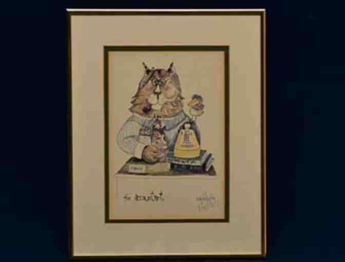 Harold, the accountant cat, sits behind a desk with a pile of books in this signed caricature. 11"x14" See close-up for artist's signature.
