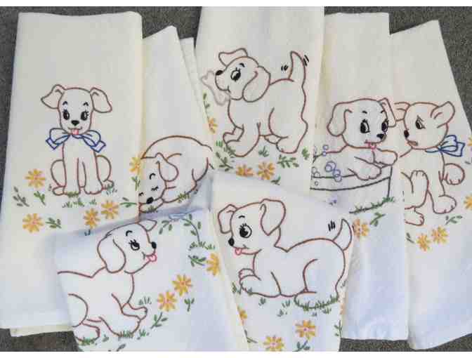 Set of 7, new, hand embroidered natural colored kitchen towels. 28"X18", 100% cotton, machine wash cold, dry on low heat. Every time you use these towels in the kitchen think of all the happy dogs enjoying their lives in freedom and how we are working to make that the case for every dog! A couple of these dog designs even look a bit like our Harley.