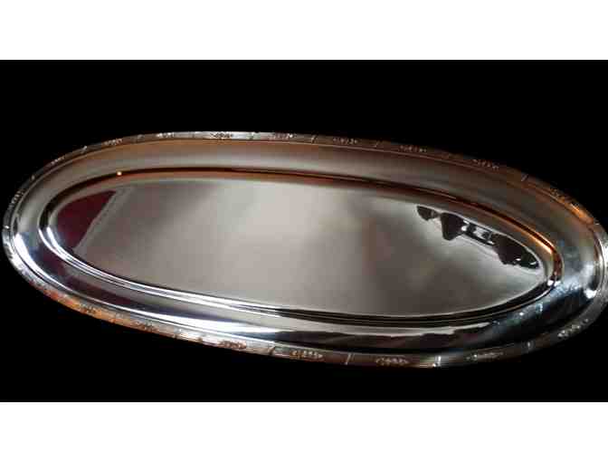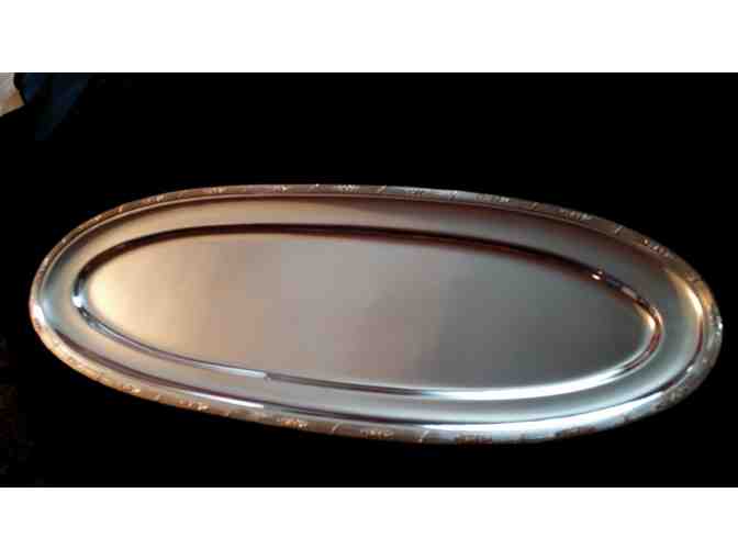 Silver Platter - this elegant oval serving platter measures 23½ inches by 9 inches; the outer border is finely ribbed with bas relief floral accents; magnificent condition with minor scratches commensurate with age; the tray is heavy weighing about 4 pounds; hallmarked.