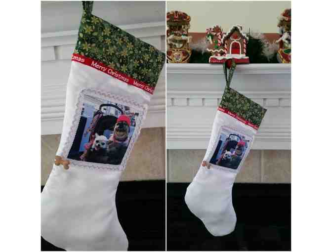 Handmade by Sharie Krebsbach. This white satin sock features Teddy and Princess Eleanor. The two are anxiously waiting for Christmas. Accented with a bone shaped button in the corner of the image and a green, holiday-floral patterned material with ribbon trim that reads "Merry Christmas" for the sock's top. Sock measures 16 inches long by 5 1/2 inches across. It has batting on the inside and is lined with white cotton material.
