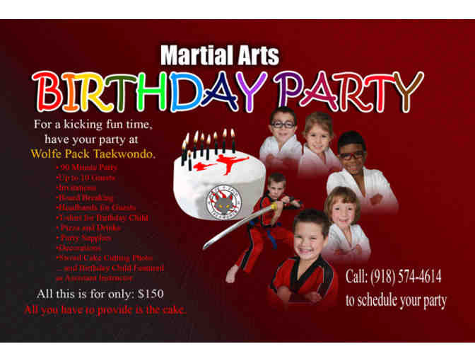 Ninety-minute Taekwondo-themed birthday party for up to 11 people. Includes a Taekwondo class, invitations, decorations, plates, napkins, plasticware, drinks, and two pizzas.