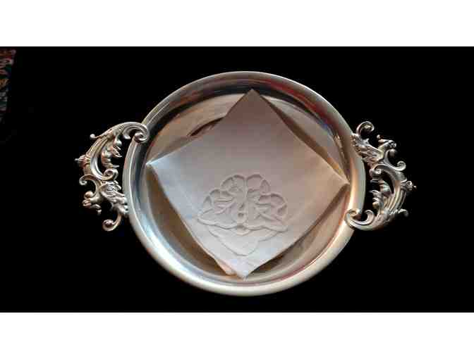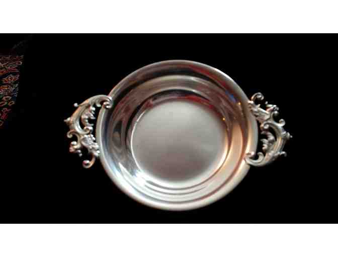 This small round silver bowl has two ornately perforated handles; the bowl is 6 inches in diameter and 8½ inches long with the handles; hallmarked American antique sterling silver;