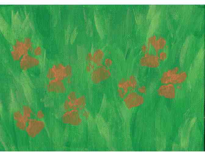 "Toes in the Grass" is #8 in the Art by Teddy 'Where the Toes Can Go' collection. This is a unique, one-of-a-kind painting using non-toxic acrylic paints on a 5" x 7" canvas which includes Teddy's paw prints.