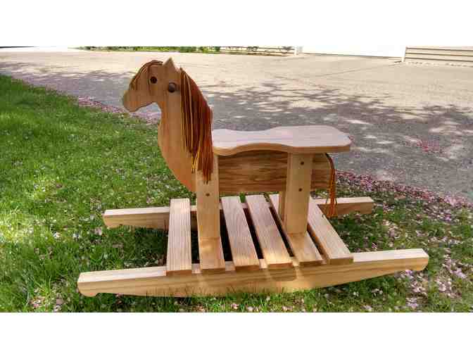 This lovely hardwood rocking horse is made of solid oak, maple, and walnut and is tassled with deerskin and elkskin. It stands approximately 24 inches high and is nearly 3 feet long. It is the kind of quality that will last through time. Hand crafted by woodworker Jep Hostetler, Goshen, IN.