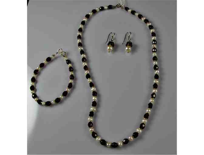This three-piece set includes a necklace, bracelet and earrings. Each piece features rich creamy freshwater pearls with intermingled deep red Czech and gold plate beads. The necklace and bracelet have gold plate clasps. The necklace is 18" and the bracelet is 7.5" in overall length.