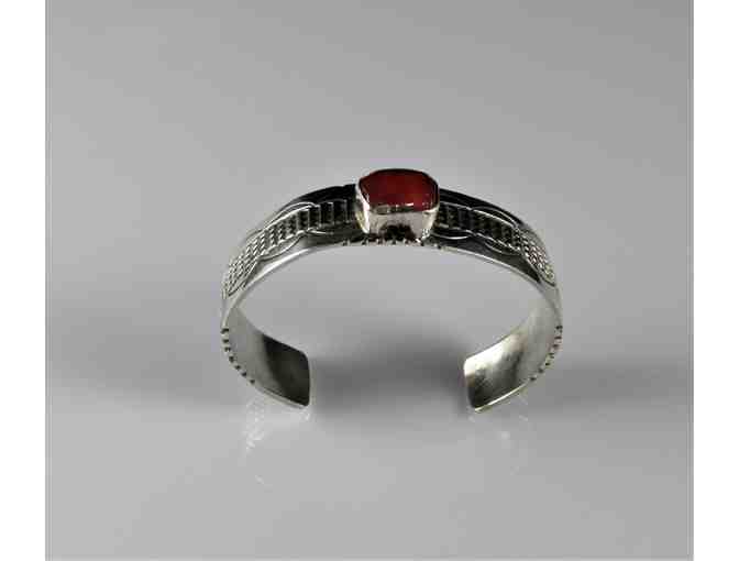 Native American-style, imprinted sterling silver bracelet with coral stone, approximately 5.5" in length. Bracelet bends slightly to slide onto wrist.