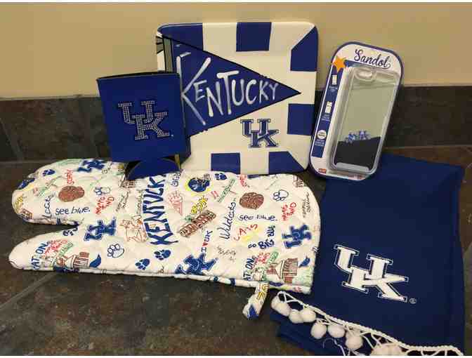 Show your Kentucky spirit with this themed package! Includes a UK potholder, platter, tea towel, koozie, and phone case. Everything you need to get ready for football season!
