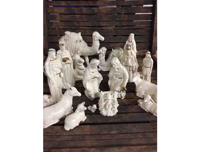 Extra large porcelain Nativity Set with the tallest piece being the camel that measures 12 inches. Set includes 17 pieces. Includes two baby Jesuses.