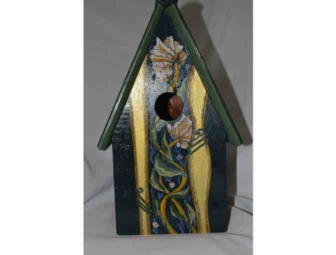 Upon a recent trip to chicago, I was reminded how much I have always like the Art Deco style, particularly its emphasis on vertical lines and its modernizing, streamlining interpretations of nature and industry.  My birdhouse design was inspired by both the exterior and interior qualities of Art Deco skycrapers and the floral wallpaper patterns of late 1800s designer William Morris, a forerunner to the Art Deco style."  - Danellen DeHuff