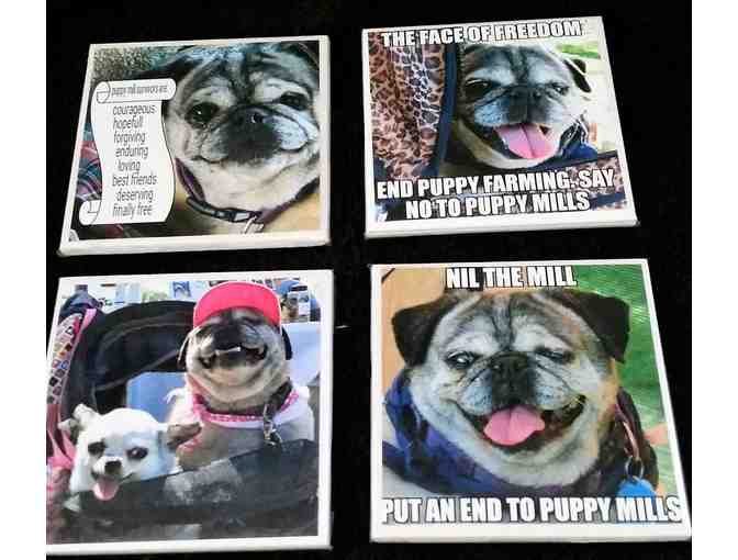 New, set of 4 coasters featuring Princess Eleanor, and one with her friend Teddy! Coasters measure 4x4 inches with felt on the back. Celebrate Princess Eleanor (and Teddy's) joy for life beyond the cage and know you are supporting Harley's Dream to end puppy mills! These unique coasters spread puppy mill awareness to your beverage drinking guests without having to say a word.