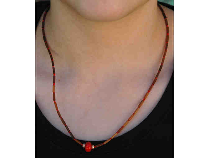 Stand out with this one of a kind necklace handmade by artist and designer, Benny Alba. Center bead is handmade, surrounded by copper and elongated beads.