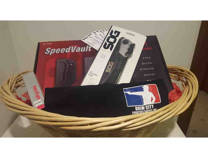 Brew City Shooters Supply SpeedVault, Range Passes, SOG Folding Saw, Knife, Tshirt