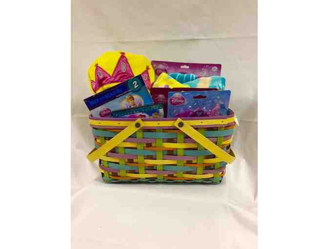 Wow the little girl in your life with this basket packed with princess power: mermaid beach towel, princess hooded bath towel, "Little Mermaid" DVD, two princess bubble wand sets, princess plate and utensils, princess squeeze bubbles, princess phone, Elsa custom-made Tic Tac Toe set, Disney Jr. playing card set, and princess book and necklace set.