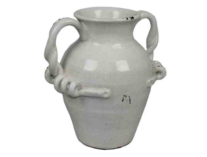 Unique details around the handles adds a great touch to this classic white vase. The antiqued finish incorporates some dark gray and warm copper, all completed with a high gloss.