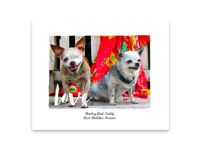 "Harley and Teddy - Best Buddies Forever" 8"x10" Art Print on Signature Cardstock. This adorable and unforgettable image features Harley and Teddy happily posing on a wood-railed bench draped with a brightly colored tapestry. The word "love" stands out in the bottom left corner of the photo reminding us to love as Harley and Teddy loved each other- forever the best of buddies. This statement piece would make a fantastic gift for your best friend, and if he or she doesn't know about Harley and Teddy, it would be the perfect way to share their stories and friendship!