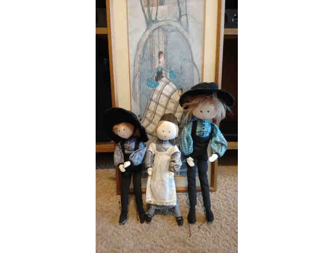 This lot includes three hand-sewn dolls, similar to the Amish children figures seen in P. Buckley Moss prints. The dolls are approximately 15" tall.