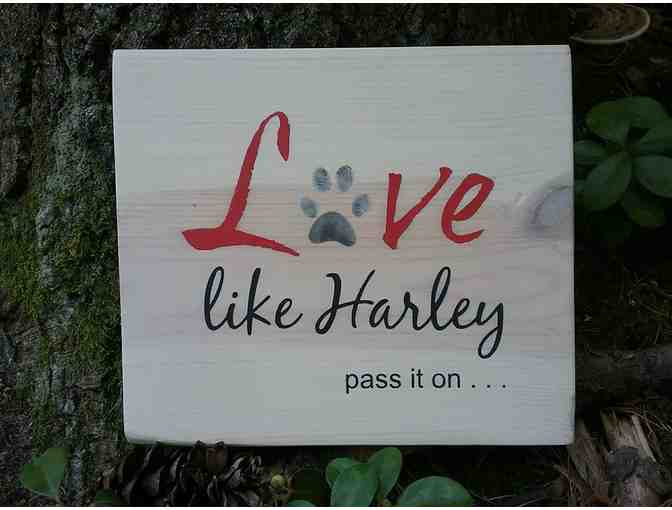 Hand-painted, white-stained sign with red and black letters that read "Love Like Harley, pass it on...". Measures approximately 8.25" x 7.25". Always be reminded of one of our hero's most important messages - love. This beautiful and intriguing sign is sure to start many conversations about Harley and his dream to end puppy mills!