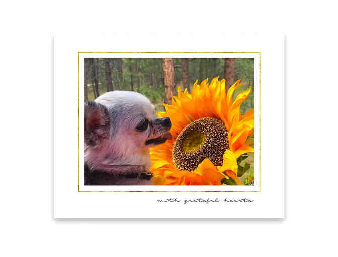 "With Grateful Hearts, Teddy" 8"x10" Art Print on Signature Cardstock. This fantastic image features Teddy appreciating a beautiful, large sunflower in the woods. The caption reads "with grateful hearts". Like Teddy, we are grateful for Harley. For Harley's friendship, leadership, humility, love and beauty. We will show our gratitude for Harley and all he's taught us by making his dream come true. Together, we WILL end puppy mills!!!