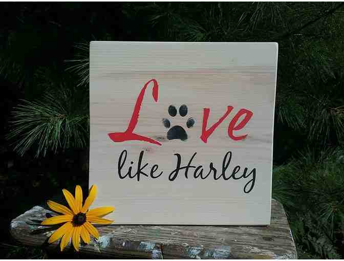 Hand-painted sign with red and black letters that read "Love Like Harley" on white stained pine. Measures approximately 7.25" x 7.25". Always be reminded of one of our hero's most important messages - love. This beautiful and intriguing sign is sure to start many conversations about Harley and his dream to end puppy mills!