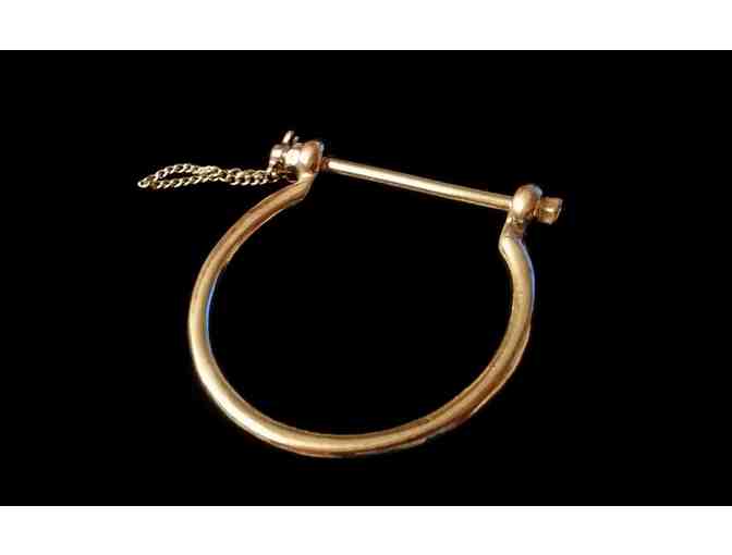 Stunning crew cuff bracelet with attached safety chain is in polished yellow gold.