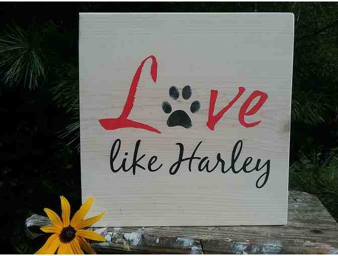 Hand-painted sign with red and black letters that read "Love Like Harley" on white stained pine. Measures approximately 7.125" x 7.25". Always be reminded of one of our hero's most important messages - love. This beautiful and intriguing sign is sure to start many conversations about Harley and his dream to end puppy mills!