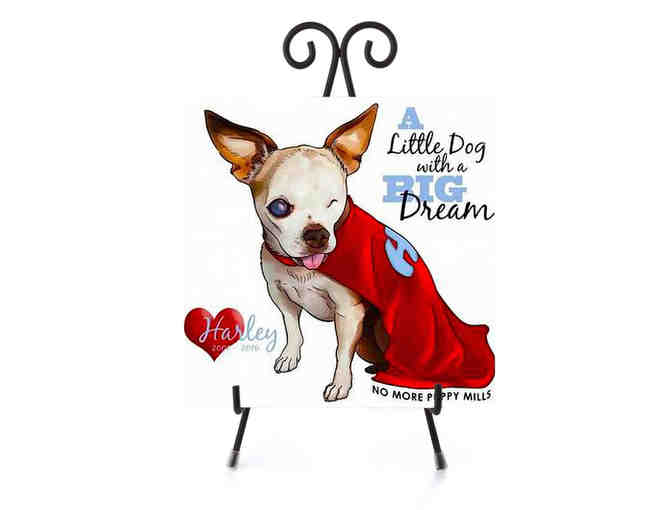 Custom, glossy ceramic tile featuring the "A Little Dog With a Big Dream" commemorative image. Display on the included wrought-iron easel. Makes a perfect addition to any space. Not only meaningful, but what guest won't ask about the story behind this special decor? Then you can tell Harley's story and the meaning of his dream!