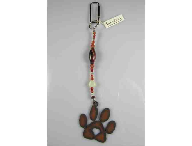 If you love dogs, you will love this key chain. This one-of-a-kind key chain features a rustic metal dog paw with heart cutout with Carnelian agates and pewter beads, strung on sturdy wire. It has a rectangle shaped key holder.