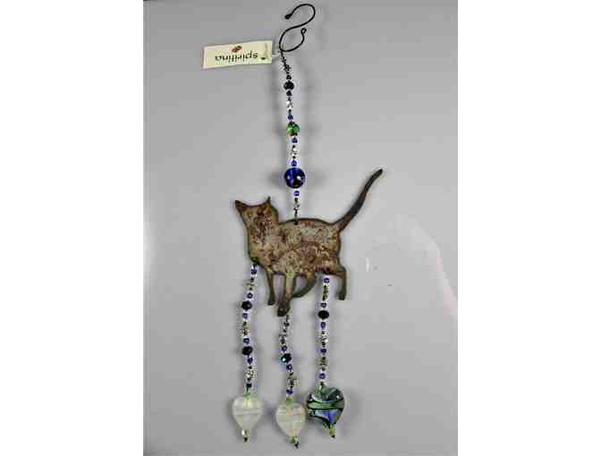 This ornament / sun catcher features a large rustic metal cat is adorned with crystals and Czech glass heart dangles.