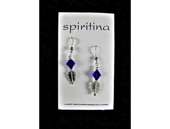 These one-of-a-kind handcrafted earrings feature rich, dark blue Swarovski crystals, Czech leaves, and sterling silver spacer beads, suspended from sterling silver wires.