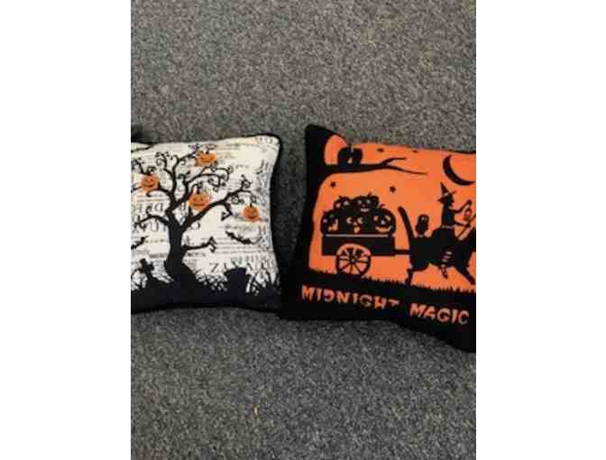 Jack O Lantern pillow by C and F  Enterprises and "Midnight Magic" pillow by Bethany Lowe Desings. Each pillow is approx. 13x13 inches.