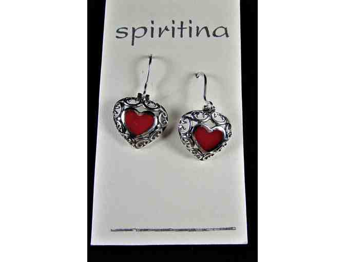 These earrings have Sterling Silver hearts with embedded rich orange Coral hearts, suspended from Sterling Silver wires.