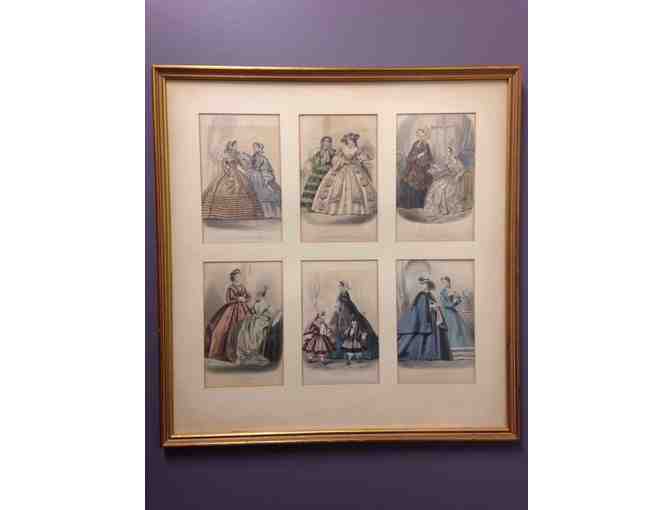 Framed set of six hand-tinted engraving magazine prints: “Home Magazine,” engraved by Capewell & Kimmel in June, November, and December 1859; “Graham’s Magazine,” engraved by Toudouze and imported from Le Follet, 1849; and “Les Modes Parisiennes,” engraved and printed by Illman Brothers, February and March, 1864. Measures 23.75” x 24.75” with gold frame.
