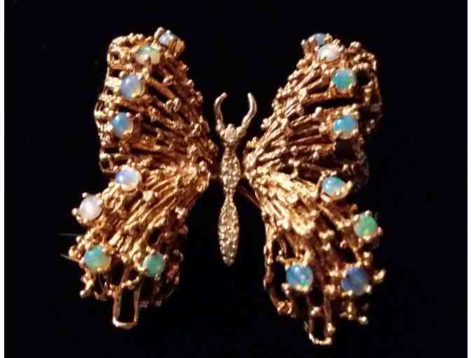 Intricately carved butterfly pin has wings of 14K yellow gold and a body of 14K white gold; the wings are encrusted with a total of 16 lively round opals; the opals are shot through with blue and green flashes; the body is set with 8 faceted diamonds; all the opals and diamonds are set in open base settings allowing the light from below to give the stones extra brilliance; the pin measures 1½ inches by 1¼ inches.