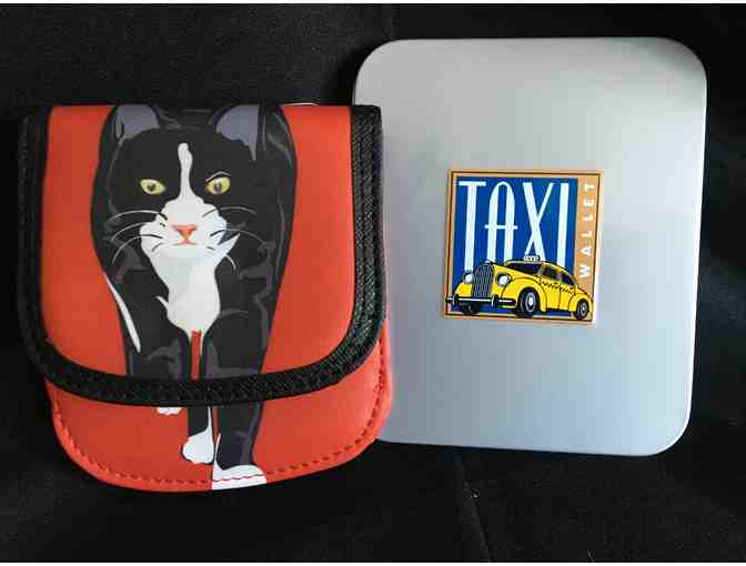 Dedicated to feline friends and their adoring fans, this compact RFID-protected Tuxedo Cat Taxi Wallet with inside coin pocket, outside card pocket, and divided currency compartment fits comfortably in a front pocket or small handbag.
