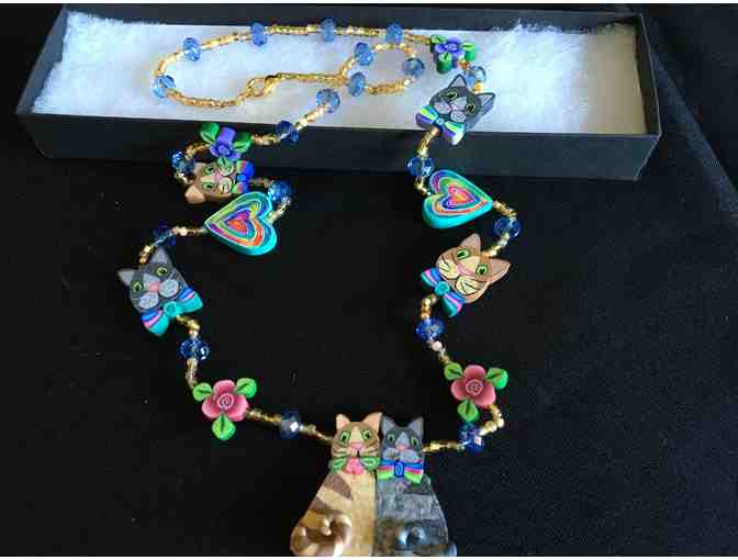 Heads will turn when you wear this unique necklace by a California artisan who takes a whimsical turn with her millefiori "Feline Fondness" necklace. She brings her delightful creations to life as she layers multiple strips of colorful polymer clay, which are then stretched and pulled into canes and sliced into thin cross sections. She then adorns the necklace with beaded accents.