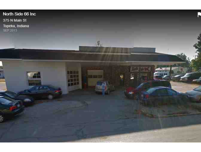 The successful bidder will receive a certificate worth $250 toward automobile repair, services, or products at North Side 66 in Topeka, Indiana. Bob Kauffman is a veteran car mechanic with a sterling reputation. Many Goshen residents "go-the-distance" to take their cars to Bob. Many will leave their cars with Bob for the morning, stroll through the fascinating downtown Topeka, walk to Tiffany's restaurant (which by the way, has two gift certificates for sale in this auction) for a tasty lunch, or pie and coffee, or one of their excellent hot dogs.