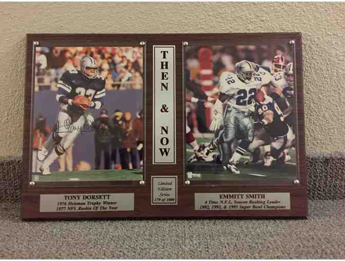 Own this limited edition series (179 of 1,000) "Then and Now" Guaranteed Authentic autographed photos of Tony Dorsett and Emmit Smith. The photos are encased in a beautiful wooden frame.