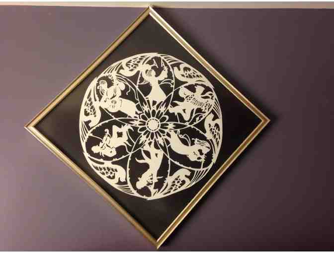 Eastern-European style circular papercut folk art. White-on-black paper featuring six musicians and birds. Measures 21” x 21” with silver frame.