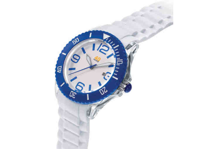 It's "time" to bid on this stylish 40Nine white watch, perfectly accented with blue trimmings from Kaya Jewelry. Stylish and practical, this is the perfect watch to wear with anything and ensure that you're never late again!