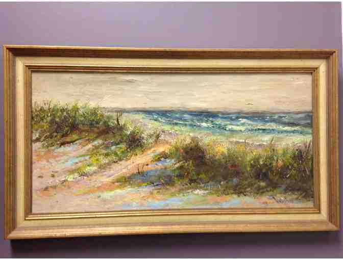 Seascape painting of Cape Cod dunegrass and ocean under a grey sky. Signed by the artist, Jane Burns. Acrylic on wood. Measures 15.25” x 27.25” with gold frame.