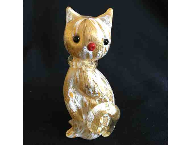 The Campanella family of Murano handcrafts each sculpture using traditional millefiori techniques. First they layer hot strands of white and gold glass rods into beautiful patterns. They slide the rods into cross sections and piece them together to form a cat figure with gold leaf accents.